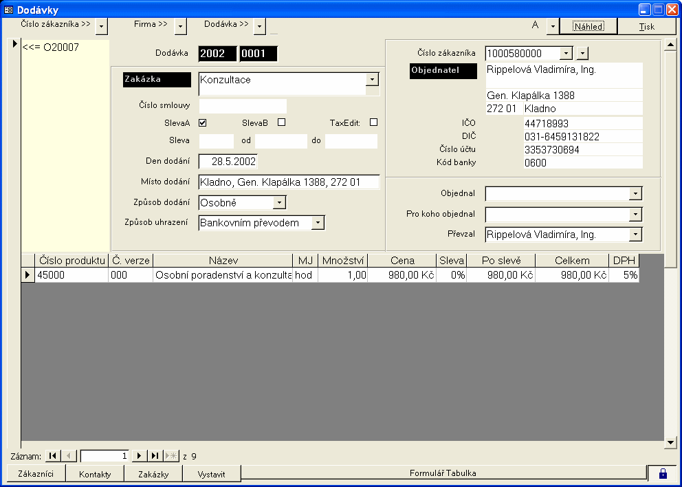 Formulář Dodávky slouží k evidenci dodaných produktů zákazníkovi